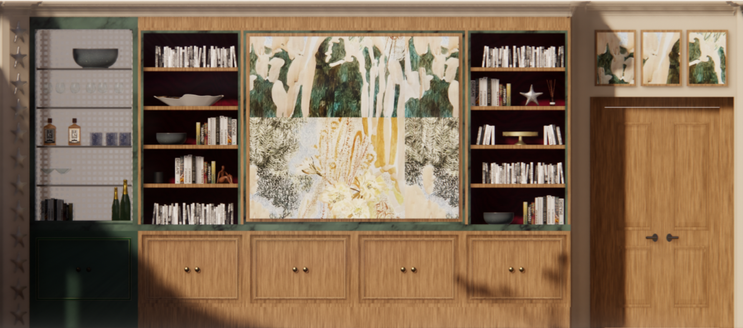 This is their secondary living room and could be used for socialising - this inspired the ideas to divide a piece of art into two panels that can join together to hide the television.